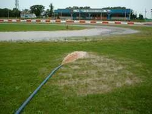 A bright spell! It wasn't raining! We rushed out to see what could be done. Gerald was sure that if there was to be no more rain then the meeting could go ahead. Punch and I weren't so sure and Roy was sure that he was either suffering from a dose of Trench Foot or that his toes were webbing, duck style, in the soggy conditions. A gateway that Punch had dug out - it had filled with sodden sand - was filled again. As I walked down the back straight I left footprints, Man Friday style, in the shale, the water now bubbling up around my boots. And then it rained again. At just after two o'clock the heavens opened and all hell fell on the stadium. It took just five minutes, but in that time we watched the water spread across the floor of the staff room. Out on track, Lake Russell, named after our esteemed owner, burst its banks. The drains could take no more. While Roy and used a small Honda pump to pump water onto the centre green, Gerald, Punch, Rosco and Olly Allen, who had appeared at lunchtime, brought the water tanker out and we started to try to pump the water away. As fast as we pumped, more water just gushed down the white line. Eventually Roy and I had to stop our pumping onto the centre green. It was now so wet and waterlogged that the water was actually running back onto the track! If it hadn't been so awful it would have been tragic. Quite why we were doing this was beyond us. But the Dunkirk spirit kicked in and we became determined that we would at least clear the standing water. Roy was now so cold and wet that we sent him home. Shortly after came the news that further heavy rain was expected and the meeting was called off. But still we splashed and pumped for all we were worth. 12,000 gallons later and all of the water was gone from turns 1 and 2. That water was now forming a swimming pool in the middle of the pits car park. No doubt some people will be disappointed that the match didn't go ahead. Some will point the finger of criticism at the track staff for not doing enough. But as I sit here, slowly thawing and drying, I know we couldn't have done more. The lengths we go to ...