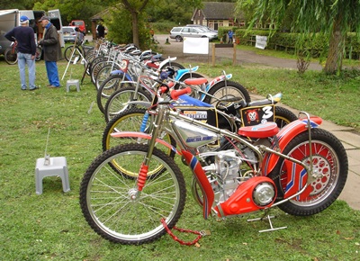The Sixth California-in-England Speedway Reunion The morning of 9th October dawned very damp and the organisers – Friends of Speedway were worried it may put people off from coming along. As the morning progressed the sky cleared and it turned out great for the event. They had organised a line-up of speedway machines to span the over 80 years that the sport has been in existence. The line of machines started with a 1928 Douglas, next a 1929 BSA, a 1930 Rudge and then through the years with a variety of JAPs, Jawas, Weslakes up to a modern laydown machine. Also something different was a rotary engined grass track machine to compliment the display. Various machines were started during the afternoon so that the assembled throng could savour the different sounds from one era to another and the intoxicating aroma of Methanol and Castrol R. By 11am folk had started to drift in and the place began to buzz with people chatting and meeting up with friends both old and new. The Friends of Speedway stall was busy with enthusiasts looking for a bargain amongst their goodies on display. All profits generated go to sponsoring the British Youth Speedway Championship series (formerly the Under 15's Championship). They also had a 1970s Jawa speedway bike fitted with a reaction tester which was great fun especially for the children attending to be able to sit on a bike and do a dummy start as if at the tapes. As part of the attractions there was an organised trip up to the old track where Bryan Horsnell, who used to sweep the concrete starting grid (and it's still there) told folk about the days of the Poppies as the team was nicknamed then. Quite a few riders were in attendance from the 1950s era which included: Jim Gleed, Eric Hockaday, Pete Rogers, Ron Webb, Dave Collett, Ernie Baker and Martin Ashby. The first four of the above riders actually all rode in the very last meeting there on 5th August, 1957 so a group photo was taken to commemorate the occasion. Also in attendance were the family of Poppies Captain, Ron Sharp and the son of Neil Roberts who also rode there. The organisers were very excited when the Daughter of Dick Newman arrived with two of her Father's trophies from California with many photos too. To put the seal on the day four times World Champion Barry Briggs arrived to chat with everyone there. He very generously donated two copies of his latest book to the organisers to boost funds to support the youngsters – thank you Barry! The organisers wish to thank all those who displayed bikes, some coming considerable distances.
