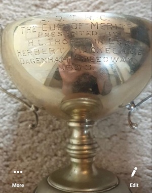 ![]() I have a cup of my Grandfather's in my possession and I am wondering if anyone can shed some light on it. On the cup is engraved. A.D.T.R.C The cup of merit presented by H.L. Thornton Esq. Herbert Mackechnie. Dagenham Speedway 1935 or 6. I vaguely remember my grandfather telling me of a close friend or even relative who died and after that my grandfather didn't ride again. Would anyone have any information please? I didn't take much notice as a young child and of course now I would like to know more.