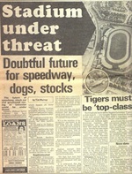 Dateline: Tuesday 15 November 1983 It was about 2.30pm in an office in Leicester. I was just getting stuck into my work after returning from lunch, probably completing a client's tax return, when I got a phone call from Tony. Like me Tony was a speedway fanatic, and like me worked in an office near the station. In a voice full of dismay he said "go get a copy of the Leicester Mercury - they're shutting the speedway - it is all over the back page. " Recalling my childhood trauma at the loss of the Tilehurst track in my native Reading I dashed to the newsagents with grim foreboding. Glancing at the front page of the Mercury, which informed Leicester's citizens of the death of Dad's Army's John Le Mesurier, I followed the front page trailer ('Leicester Stadium Shock') to the back page of the paper. And there it was: "Stadium under Threat - doubtful future for speedway, dogs, stocks" splashed across most of the page.